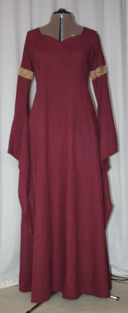 Diese Gewandung ist einlagig gearbeitet, wurde jedoch so entworfen, dass sie optisch den Eindruck mehrerer Lagen vermittelt. Gefertigt aus Leinen in Grün- und Brauntönen und mit passender Borte verziert. Die Modelle entstanden in verschiedenen Farbvarianten für die einzelnen Familienmitglieder.